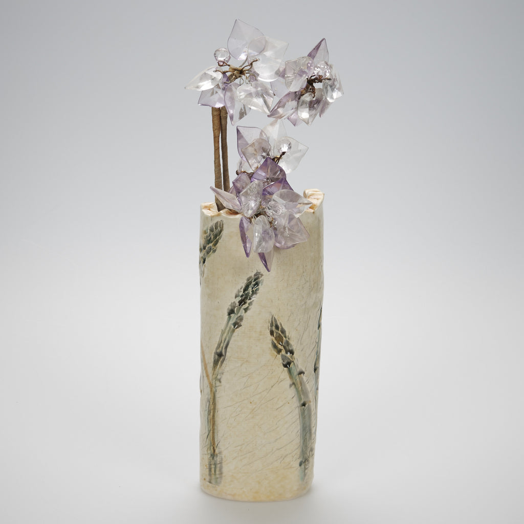 This petite asparagus vase is great for pencils and pens, lovely small flowers, or as a chop stick holder. Colors include asparagus green stalks with a hint of pumpkin spice around the edges and on the inside.