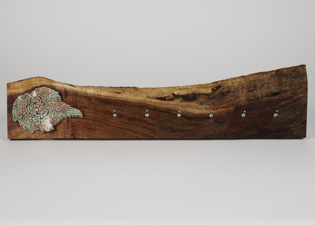 This beautiful piece of walnut wood has great characteristics through waves of color. The wood is enhanced by the reddish green begonia leaf and multiple small hanging hooks. Great to use in the kitchen for those beautiful wood utensils, pot holders, colorful oven mitts, keys, or on the wall to display your special necklaces and bracelets.